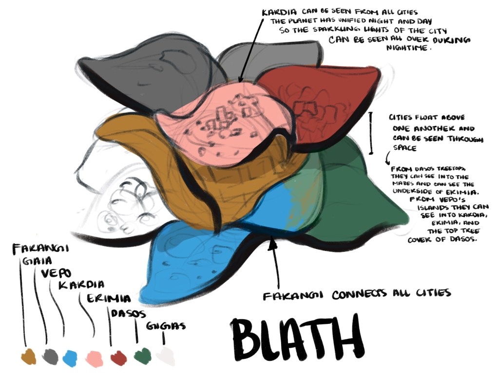 The city of Gaia used to be earth. The ancient world as we know it continued to thrive and advance by respecting their relationship with heka. At this time, humans were circulating Heka’s magic and all was balanced. Come the 21st century, the god Webb implanted knowledge of technology into human societies. Note: Technology in the 21st century is not Apple, think Bladerunner x Asgard. Over a duration of generations, humans gradually abandoned their magic practices and were pulled away from their natural internal state. Having complete control over earth, Webb’s power dominated all gods under Heka. With all of Earth’s unused magic, Webb tried to consume it. However, the raw power of Earth’s magic that had accumulated for centuries, was too powerful to control and consumed him. He imploded due to the magic’s strength causing Earth to explode into the planet we recognize as Blath. Current generations of Blath refer to this day as Keyded, the slaughter.